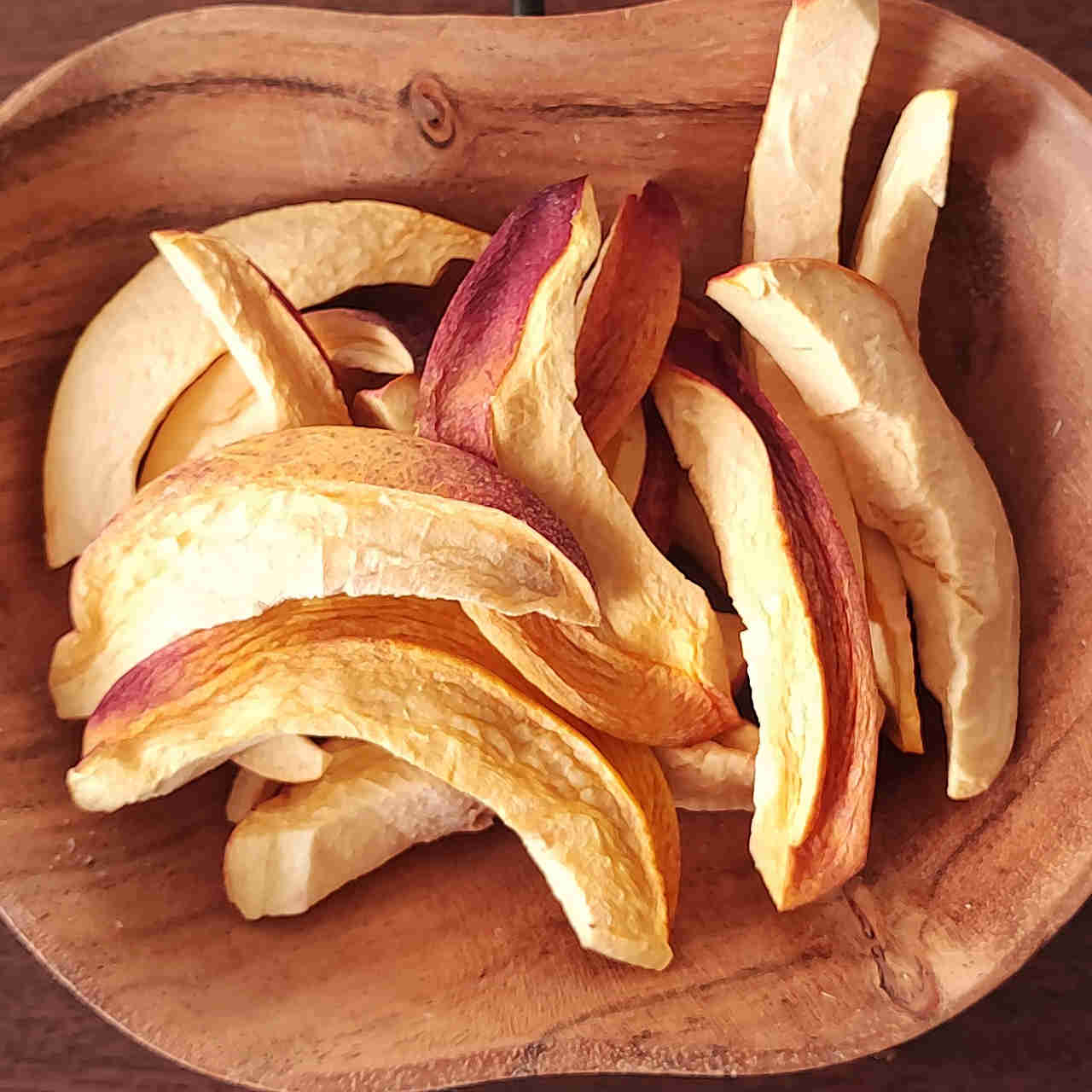 Po wysuszeniu owoc staje się kruchy i lekki, a jego aromat jest znacznie bardziej wyczuwalny niż w świeżej formie. Każdy kawałek ma wyrazisty, słodko-owocowy charakter.